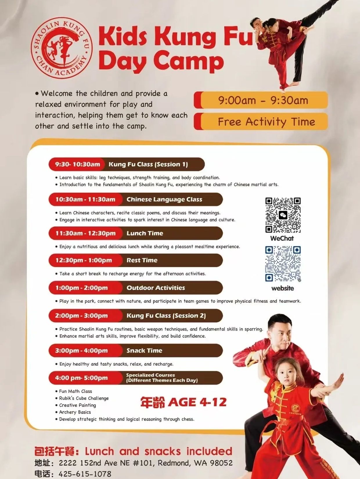 We offer regular Kung Fu classes, Summer Camp, Spring Camp, Winter Camp, Day Camp, after-school programs, Tai Chi, and more.